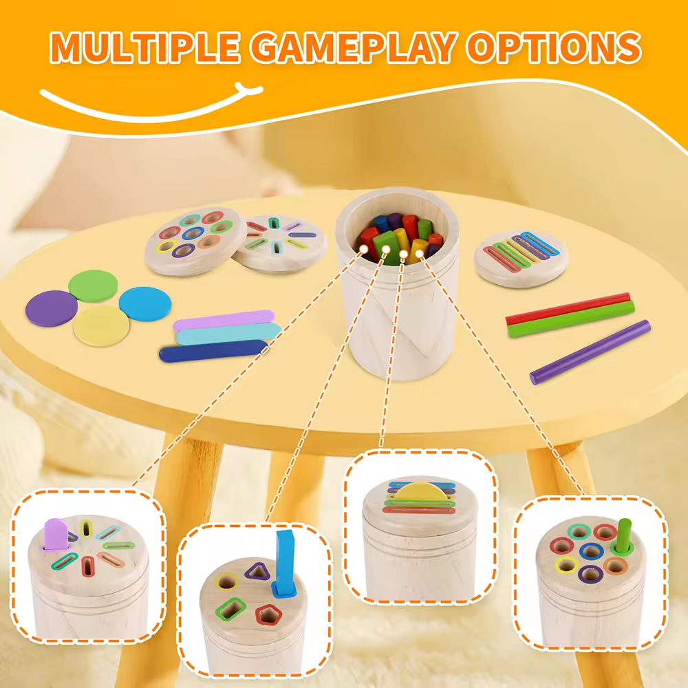 This 4-in-1 Montessori set combines color classification, stacking, sorting, and matching activities in one engaging wooden toy. Designed for preschoolers, it helps develop fine motor skills, hand-eye coordination, and logical thinking through hands-on play. The vibrant, child-safe cups and accessories encourage creativity and independent learning while keeping young minds focused and entertained.
